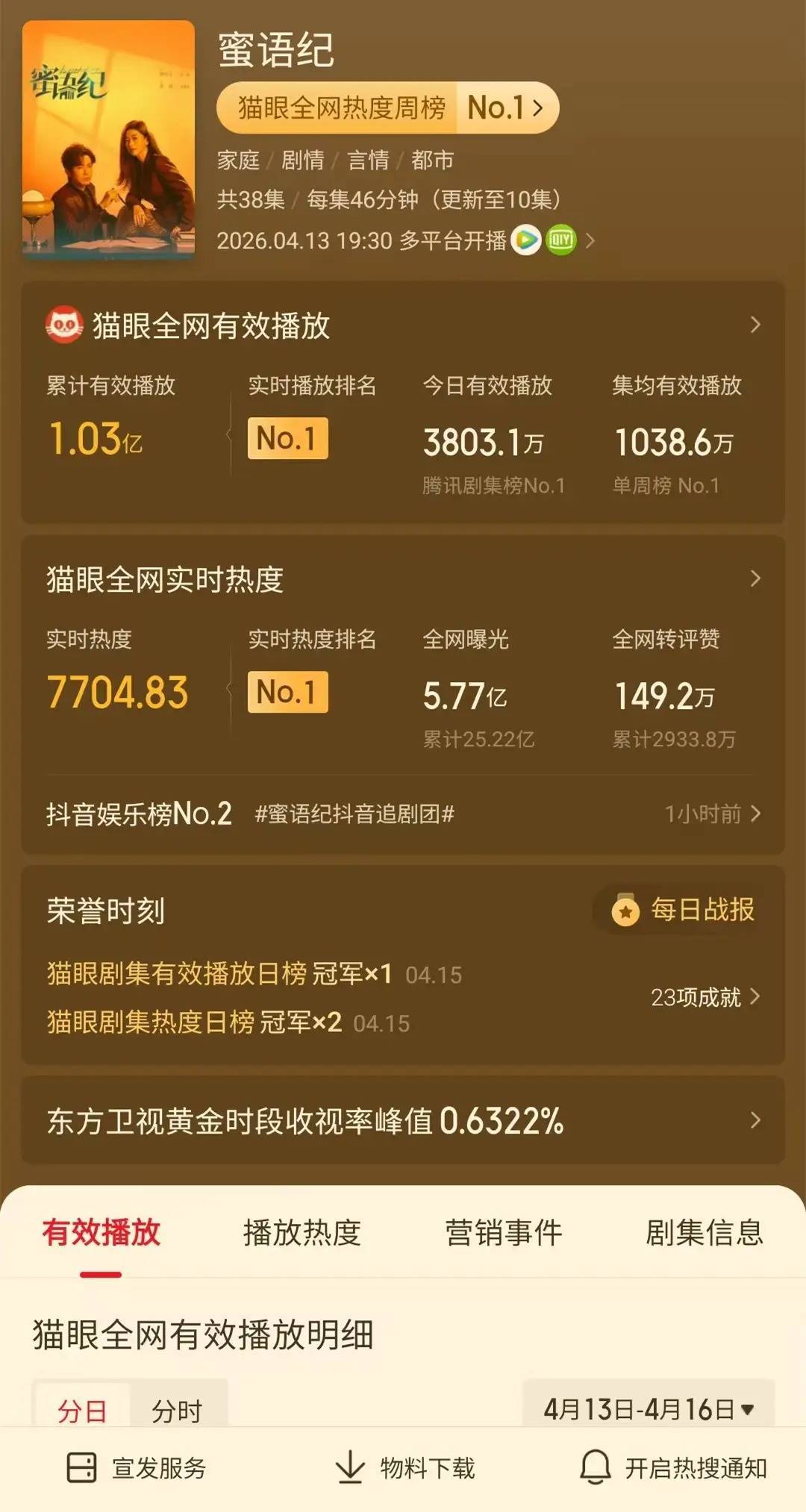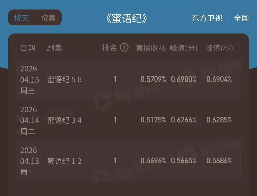 4月16日,电视剧《蜜语纪》在正版视频平台播出至第10集,于东方卫视已连续四天上星播出。从酷云和CVB的收视率数据来看,该剧收视率实现三连升。酷云方面峰值收视率逼近0.7%,与我此前预测的该剧收视率走向1%较为吻合。随着更多剧情上星播出,其在东方台收视率破1%只是时间问题。
